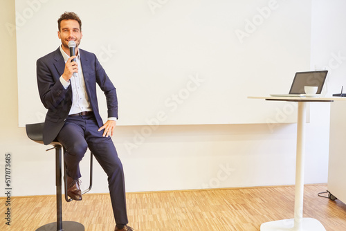 Junger Business Mann mit Mirkofon bei seinem Vortrag