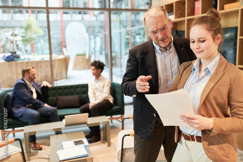 Controller und junge Kollegin prüfen Geschäftsbericht