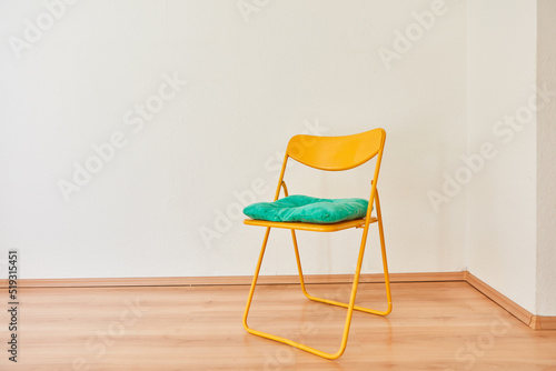 Gelber Klappstuhl mit Kissen vor Wand im Zimmer