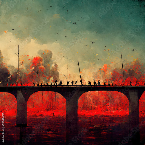 Ancient aqueduct in a rural landscape during sunset, majestic historical architecture