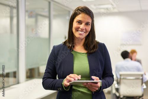 Glückliche Business Frau mit einer Tasse Kaffee vor ihrem Team