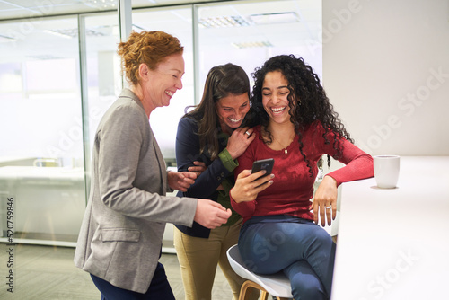 Gruppe Frauen im Büro am Smartphone beim Lesen einer SMS