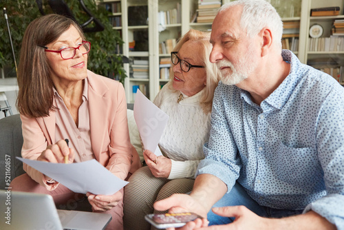 Seniorenberaterin erklärt Senioren Paar einen Vertrag