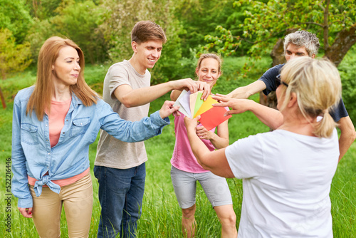 Gruppe mit bunten Karten beim Teambuilding Workshop