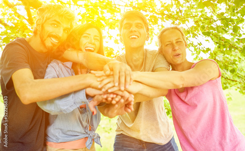 Gruppe Freunde beim Hände stapeln als Zusammenhalt Konzept