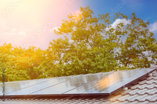 Sonne scheint auf Photovoltaik Anlage auf Dach von Haus