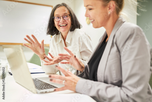 Zwei Frauen im kreativen IT Team arbeiten am Laptop PC
