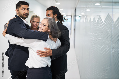 Multicultural business team hugging in a circle