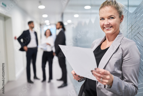 Geschäftsfrau liest einen Vertrag auf dem Flur vom Büro