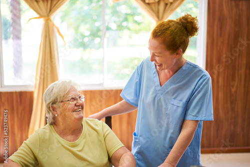 Laughing geriatric nurse sits at the bed of an elderly woman
