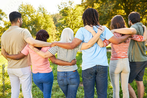 Group of people stands arm in arm in nature