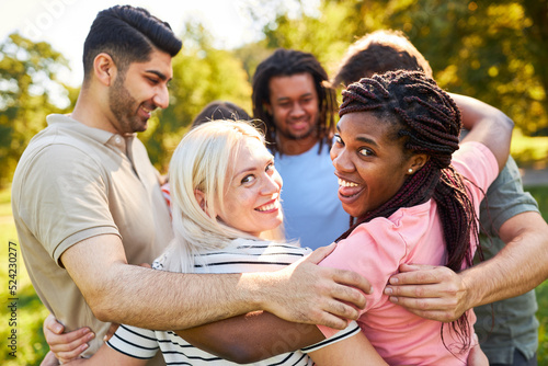 Fröhliche junge Frau und ihre Freunde Hand in Hand