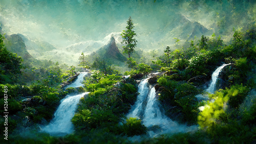 Majestic waterfall in a lush green forest with mist and sunlight filtering through