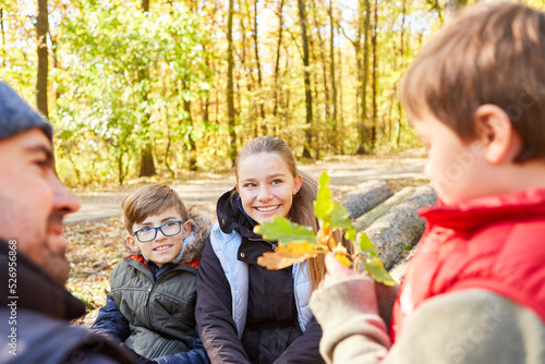 Lehrerin und Familie mit Kindern machen Baumkunde