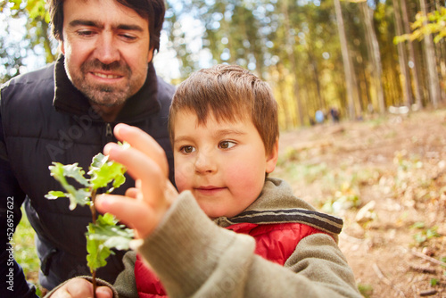 Junge und Lehrerin bei der Baumbestimmung im Wald