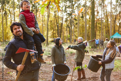 Fraiwillige Helfer und Kinder sammeln Müll im Wald