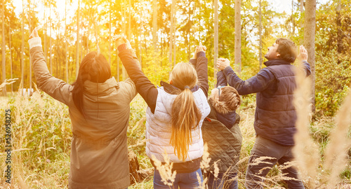 Familie berührt Baum mit Händen als Naturreligion Konzept