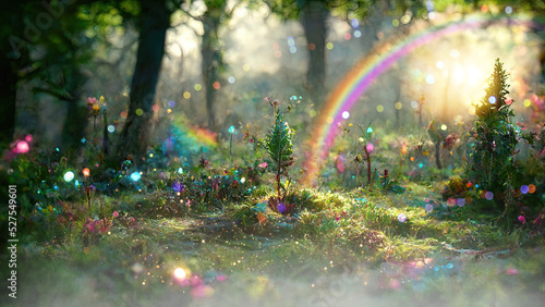 Magical fantasy fairy tale forest with rainbow and glowing lights