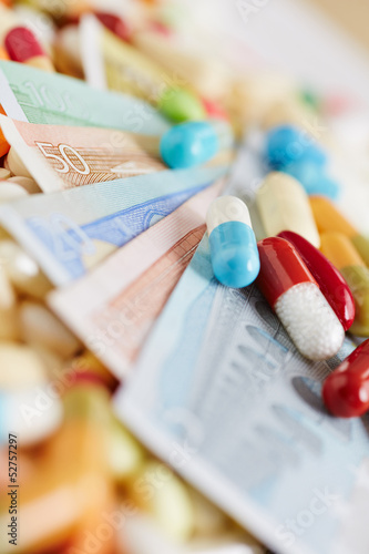 Medizin und Euroscheine mit Tabletten