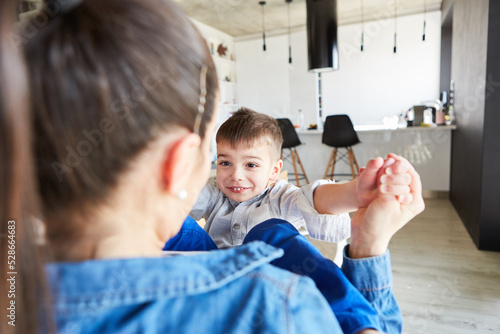 Gestresste Mutter betreut ihr Baby und telefoniert