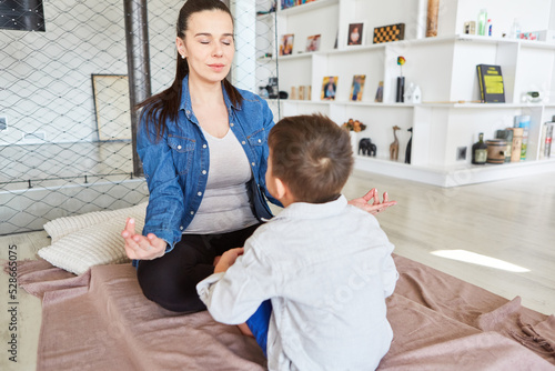 Mutter sitzt ihrem Sohn bei Yoga Übung gegenüber