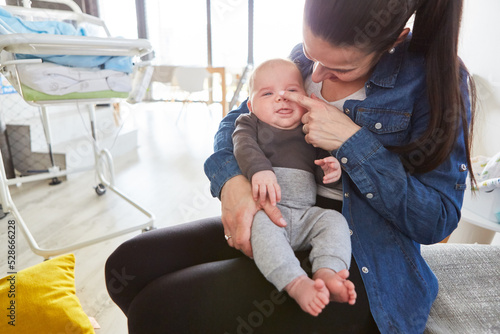 Mutter sitzt im Wohnzimmer mit Baby auf dem Arm