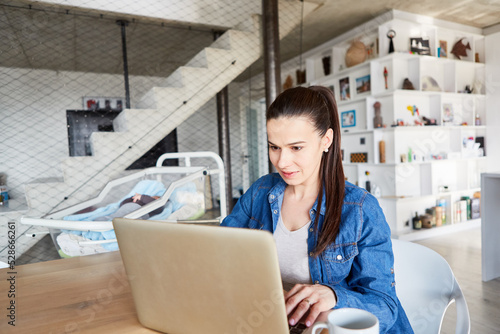 Mother at laptop PC in home office looks at baby