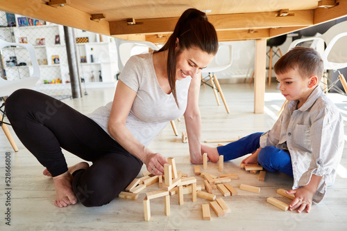 Mutter und Kind stapeln gemeinsam Bauklötze aus Holz