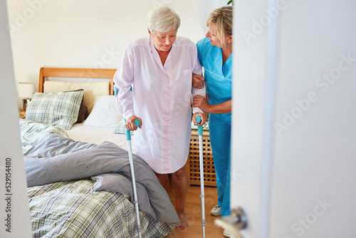 Altenpflegerin betreut Seniorin mit Krücken nach Schlaganfall
