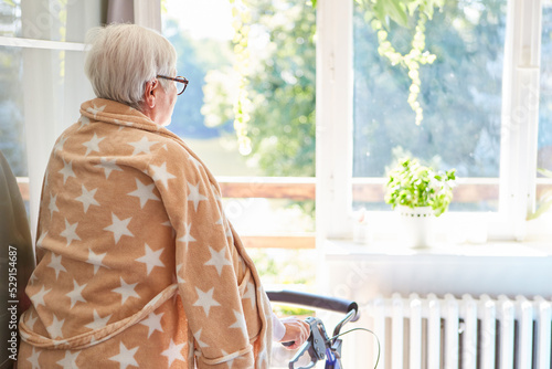 Elderly woman with rollator looks out the window in rehab