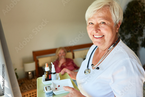 Geriatric nurse with medication on a tray