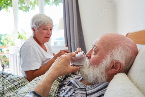 Altenpflegerin bringt Medikamente ans Bett von Seniorin