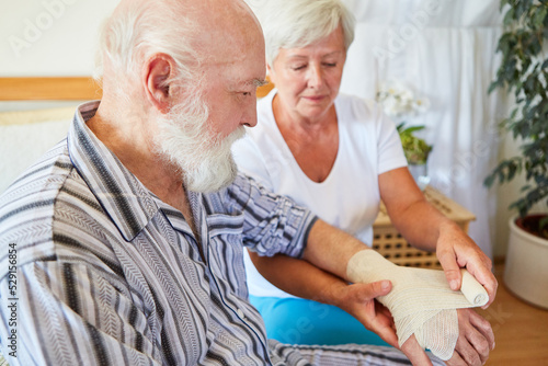 Pflegekraft beim Verband anlegen am Handgelenk von Senior