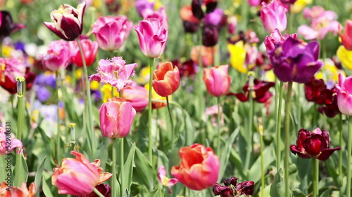 Wide panoramic view of cherry blossoms and spring garden flowers in full bloom
