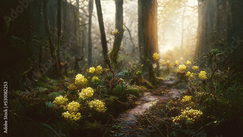Magical fantasy fairy tale forest with rainbow and glowing lights