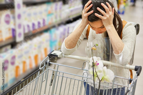 Frau mit Einkaufswagen im Supermarkt hält sich den Kopf