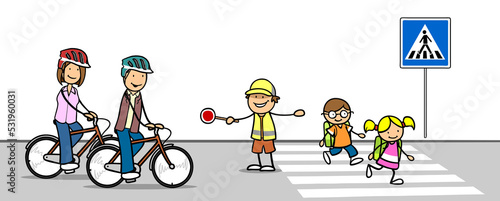 Schülerlotse hilft Kind über Zebrastreifen vor Radfahrern