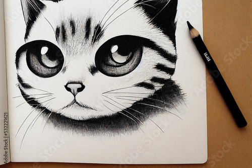 Cute cat as manga pencil drawing on paper in black and white