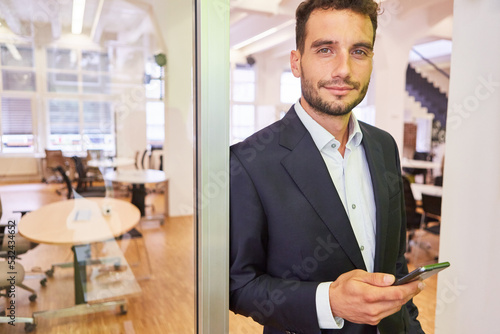 Start-Up Entrepreneur mit einem Smartphone im Büro