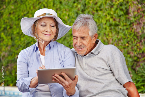 Senioren Paar in der Natur mit Tablet Computer