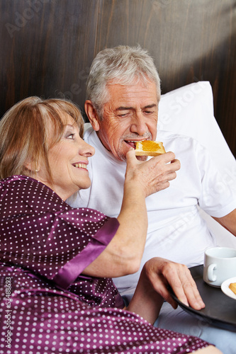 Elderly couple having breakfast in hotel bed