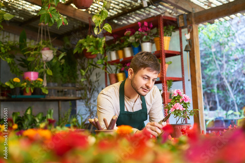 Junger Mann als Florist bei der Pflanzenpflege