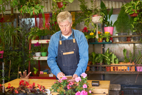 Älterer Gärtner als Inhaber im Blumenladen mit Computer