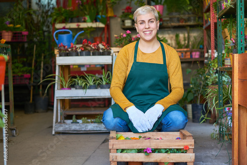 Lächelnde junge Frau als Gärtnerin mit einer Kiste Pflanzen
