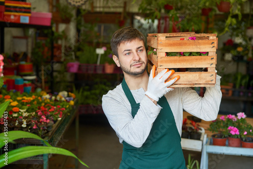 Gärtner trägt Kiste mit Blumen für den Versand