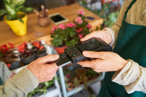 Florist mit NFC Lesegerät und Kundin beim Bezahlen