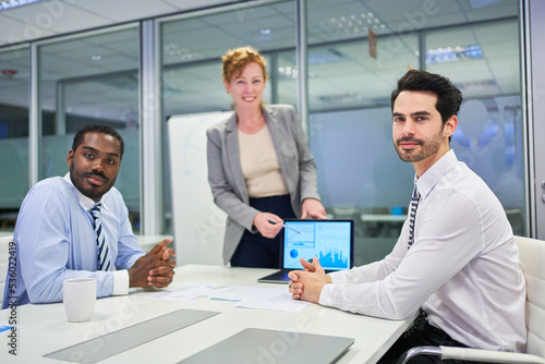 Manager als Berater zeigt auf Diagramm am Computer Monitor