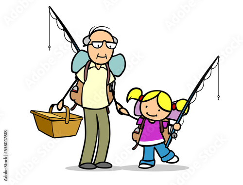 Opa und Enkel gehen Angeln beim gemeinsamen Camping