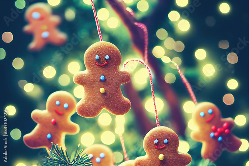 Picture of gingerbread men cookies hanging in tree as christmas decoration