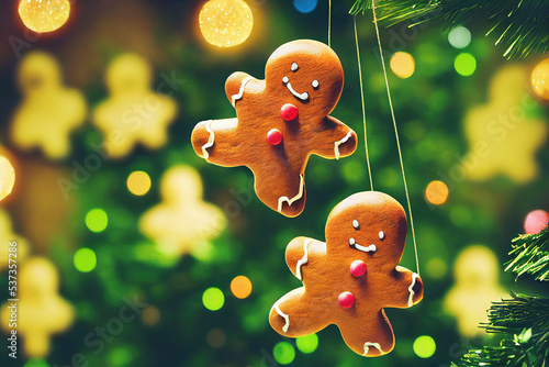 Two gingerbread men hanging on christmas tree as decoration